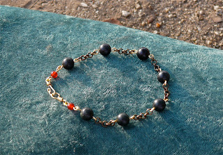 Black jasper, carnelian, and antiqued brass and gold chain. Simple and unique at once. Wear it everyday. The bracelet that goes with everything.